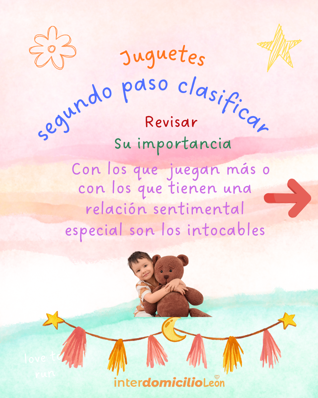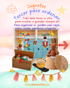 Iremos poniendo en cajas, cestas, colgadores de ropa, organizadores de zapatos colgantes, cubos, estantes o cajones. Todo debe tener su lugar para así enseñar a los niños a guardar las cosas en su sitio.