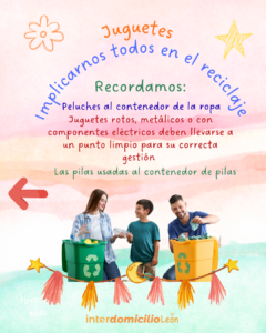 • Contenedores de reciclaje: Los de cartón van al contenedor azul, y los metálicos, a puntos limpios. Las pilas a parte al contenedor de pilas. Los peluches al contenedor de la ropa.